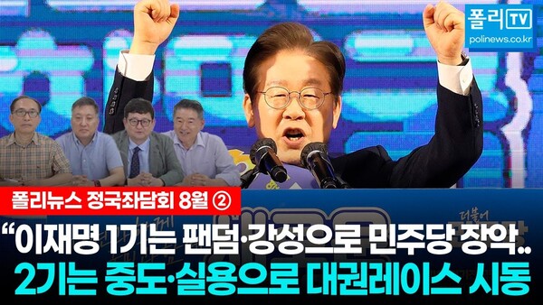 [폴리뉴스 전희재 기자] <폴리뉴스>와 월간 <폴리피플>은 6일 진행한 ‘8월 정국좌담회’에서 민주당 전당대회에서 이재명 대표의 연임이 확실시되는 상황에서 이재명 2기를 전망하는 대담을 나누었다. 김능구 폴리뉴스 대표의 사회로 서울 여의도 폴리뉴스 사무실에서 진행된 좌담회는 홍형식 한길리서치 소장, 차재원 부산가톨릭대학교 특임교수, 황장수 미래경영연구소장이 함께 했다.