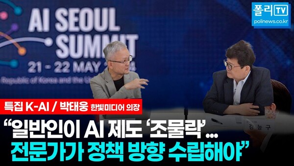 <폴리뉴스>는 ‘K-AI’의 현황을 살펴보기 위해 ‘AI 전도사'로 불리는 박태웅 한빛미디어 이사회 의장을 김능구 본지 발행인이 22일 서울 여의도 폴리뉴스 스튜디오에서 만났다.