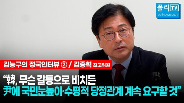 [폴리뉴스 고인호 PD] 김종혁 국민의힘 최고위원은 8일 “한동훈 대표가 윤석열 대통령께 끊임없이 ‘국민 눈높이에 맞춰주십시오’라고 요구했는데 앞으로도 계속될 거다. 또 수평적 당정관계를 획득하기 위해 그것이 무슨 갈등으로 비치든 노력을 계속할 것”이라고 밝혔다.