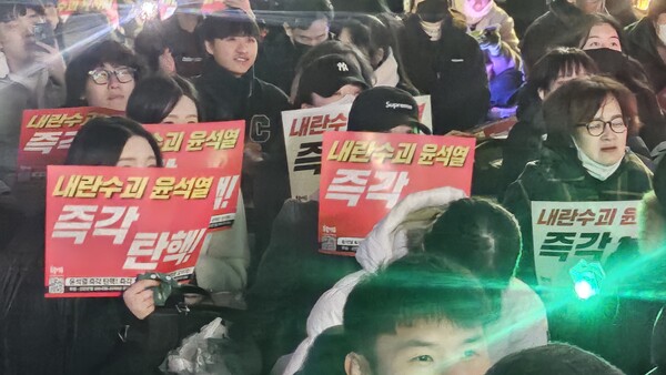 대학생과 젊은 청년 등 많은 2030세대 시민들이 ‘내란수괴 윤석열 즉각 탄핵!’ 시민 촛불 집회에 참석했다. 이들은 윤 대통령 탄핵안 가결을 바라는 간절함 속에서도 흥을 잃지 않은 모습을 보여줬다. K팝이 나올 때마다 콘서트에 온 것처럼 환호하며 ‘윤석열 탄핵’을 외쳤다. 이를 지켜본 시민들의 반응도 폭발적이었다.