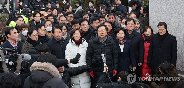 [폴리뉴스 김승훈 기자] 윤석열 대통령에 대한 공수처의 체포영장 만료일인 6일 이른 아침 국민의힘 의원 40여명은 한남동 대통령 관저로 모였다. 공수처의 체포영장 집행을 저지하기 위함이었다.