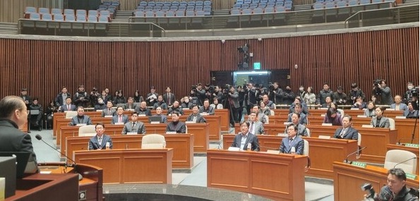 보통 의원총회에서는 같은 당 소속 의원들이 모여 인사를 주고받으며 화기애애한 분위기를 이루지만, 이날은 분위기가 달랐다. 의원들은 서로 간단히 악수만 한 채 자리에 착석했다.