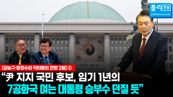 - [폴리TV] [김능구·황장수의 닥터둠의 전망 2월②] “尹 지지 국민 후보, 임기 1년에 7공화국 여는 대통령 승부수 던질 듯”