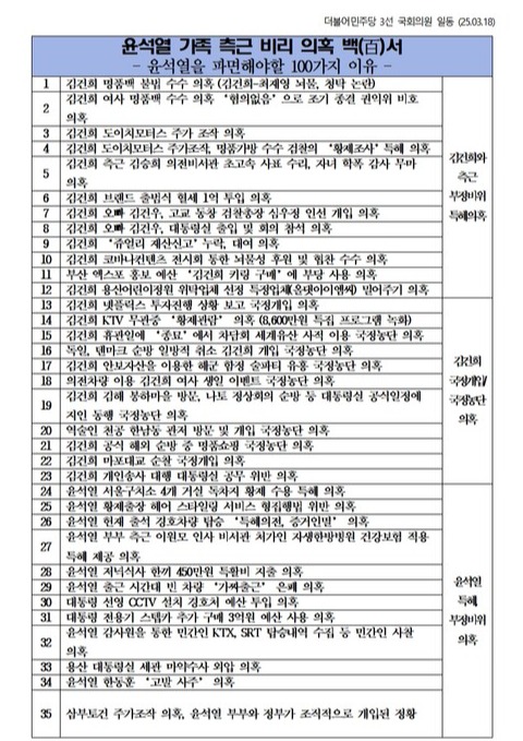 <다음은 민주당이 발표한 윤석열 가족·측근 비리 의혹 100가지>