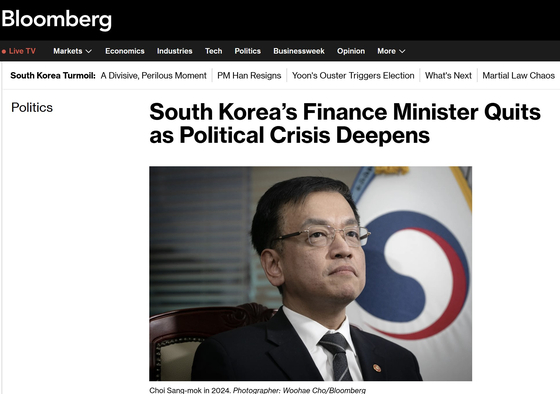 블룸버그 통신은 한덕수 대통령 권한대행 국무총리가 사퇴한데 이어 민주당의 탄핵소추 움직임에 최상목 부총리 겸 기획재정부 장관 마저 사표를 낸 데 대해 "이 나라의 정치위기를 깊게 만드는 또 다른 충격적 전개"라고 평가했다.