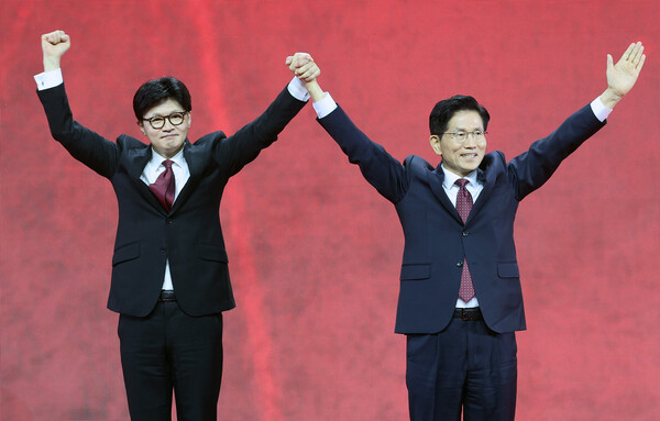 ![국민의힘 대선 후보로 선출된 김문수 후보(오른쪽)가 3일 경기 고양시 킨텍스에서 열린 국민의힘 전당대회에서 인사하고 있다. [사진=연합뉴스]](https://cdn.polinews.co.kr/news/photo/202505/692292_502647_021.jpg)
