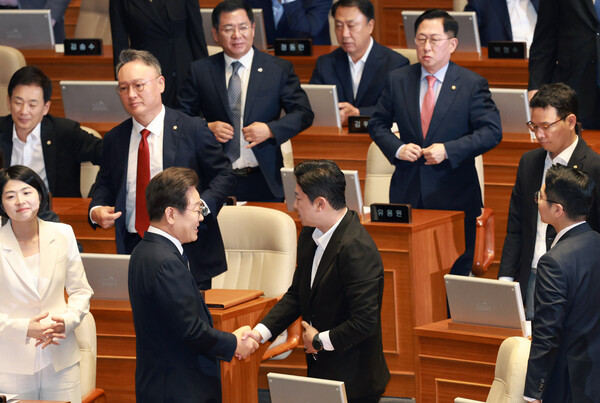 이 대통령은 국회 본회의장에서 입장해 제일 먼저 박찬대 전 원내대표와 악수를 한 이후 도열한 민주당 의원들과 일일이 악수를 하며 연단에 올랐다.