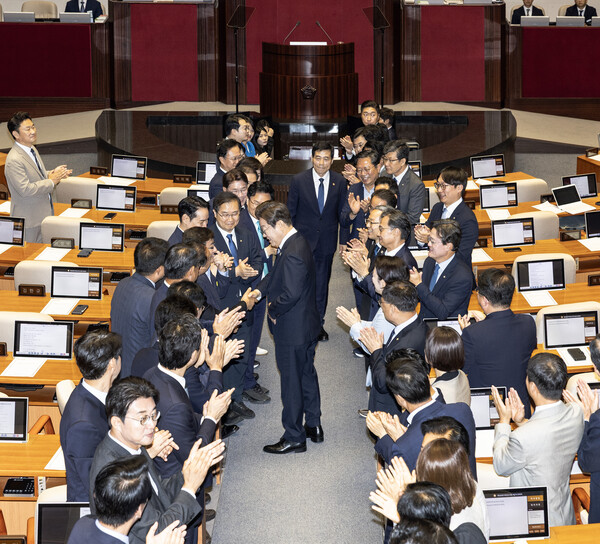 민주당 의원들이 총 12차례의 박수를 치며 이 대통령의 시정연설을 듣는 동안 국민의힘 의원들은 굳은 표정으로 이를 지켜보기만 했다.