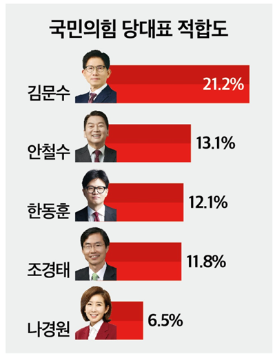 차기 국민의힘 당대표 적합도 조사에서 '누가 제1야당인 국민의힘을 이끌 차기 당대표로 가장 적합하다고 생각하는지' 묻는 질문에 김문수 전 경기지사가 21.2% 안철수 의원13.1%, 한동훈 전 대표 12.1%, 조경태 의원은 11.8%, 나경원 의원은 6.5%로 김 전 지사가 앞섰다.