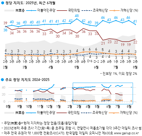 한국갤럽이 지난 12~14일 전국 만 18세 이상 남녀 1007명을 대상으로 정당 지지율 조사를 실시한 결과(오차범위 95% 신뢰수준에 ±3.1% 포인트) 민주당 41%, 국민의힘 22%, 조국혁신당 3%, 개혁신당 3%, 진보당 1% 등으로 나타났다.