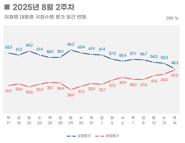 14일 일간 지지율, 긍정 48.3% 부정 47.0% '오차범위 내'