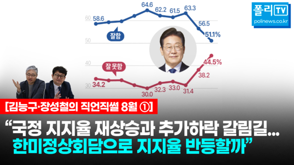 - [폴리TV][김능구·장성철의 직언직썰 8월①]"국정지지율 재상승과 추가하락 갈림길...한미정상회담으로 지지율 반등할까"