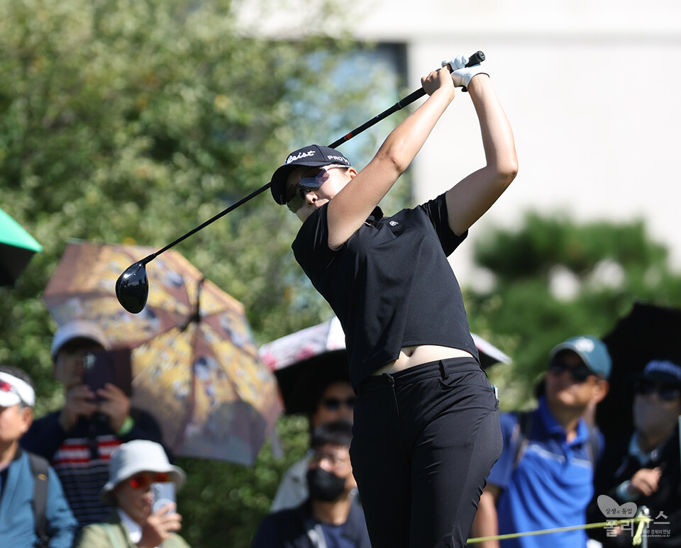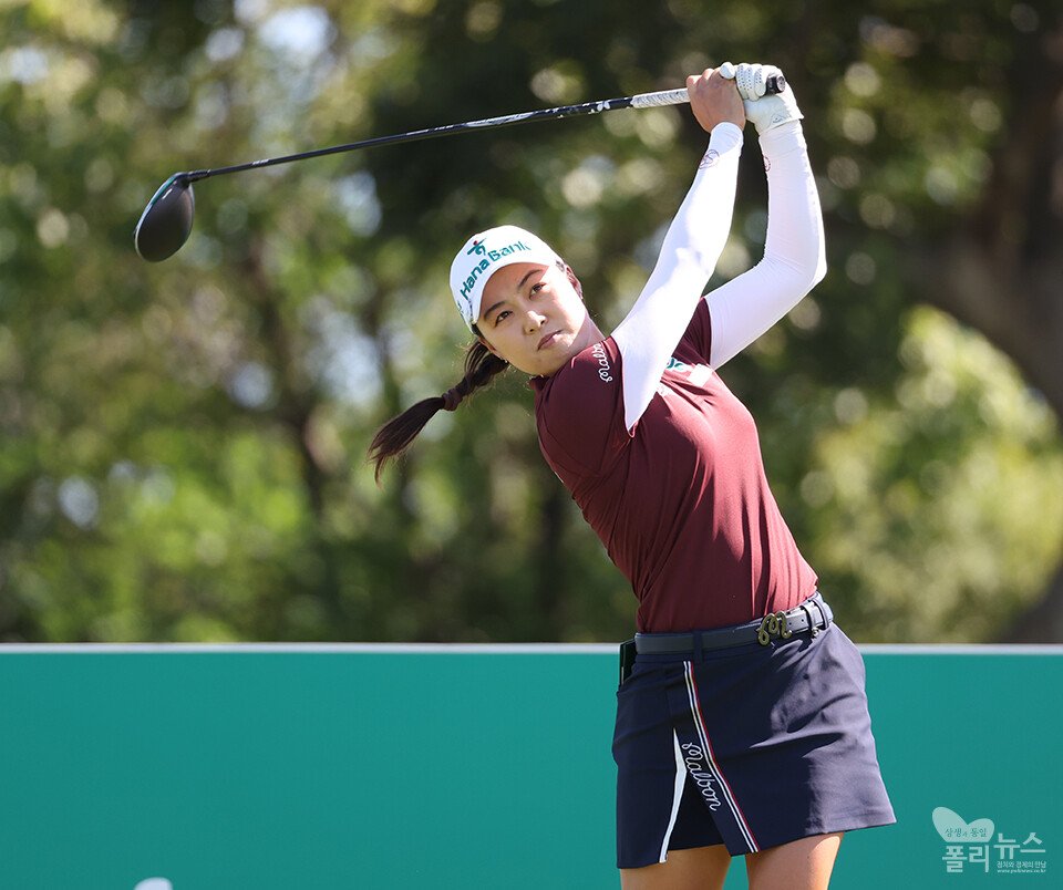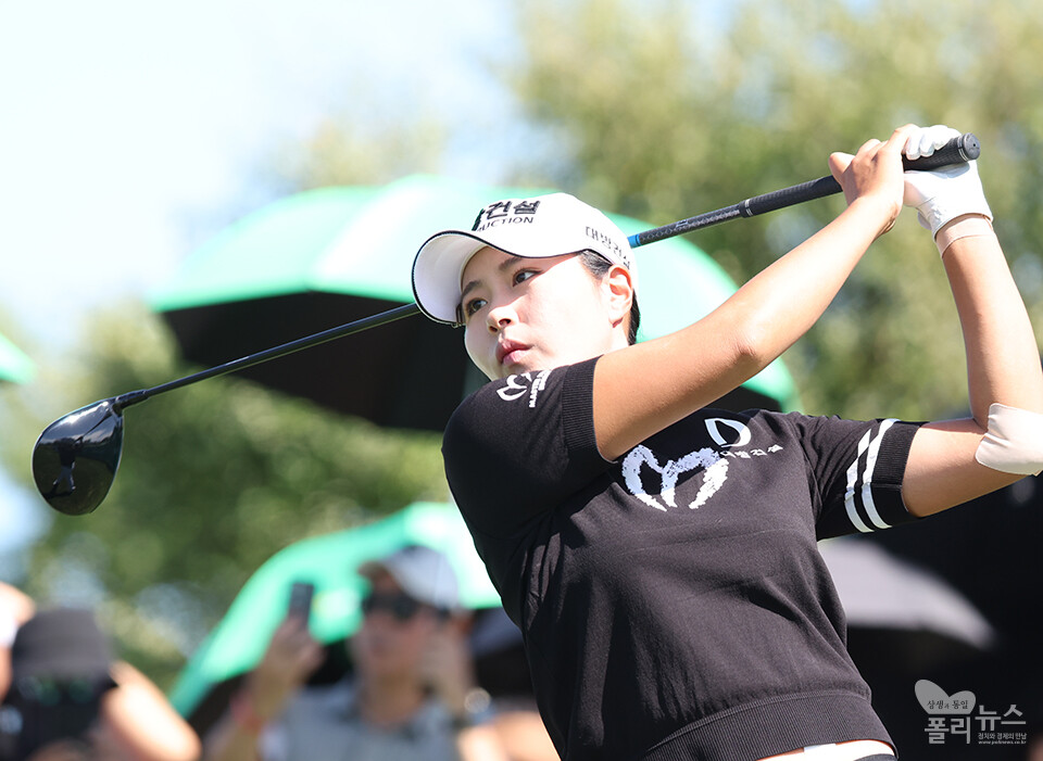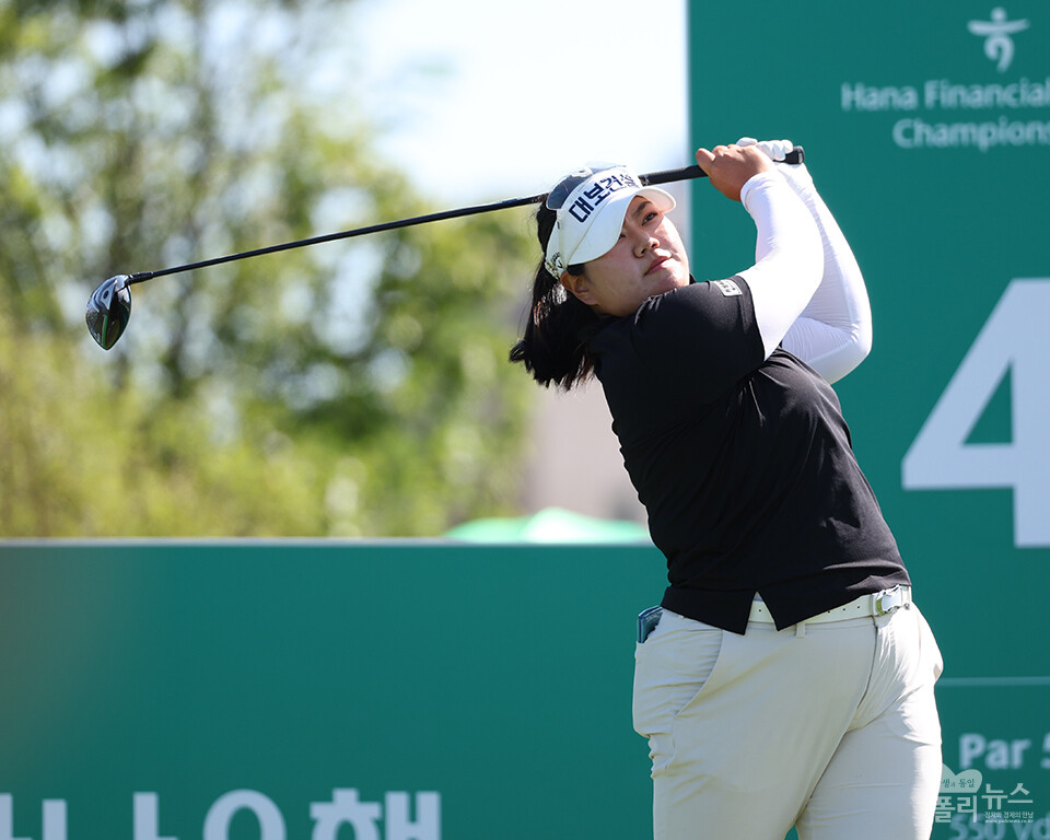 박현경(25.메디힐)이 4번 홀에서 힘차게 티샷을 날리고 있다.