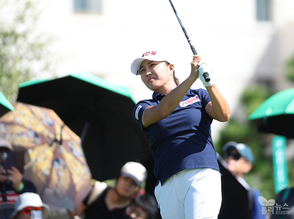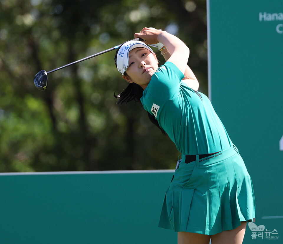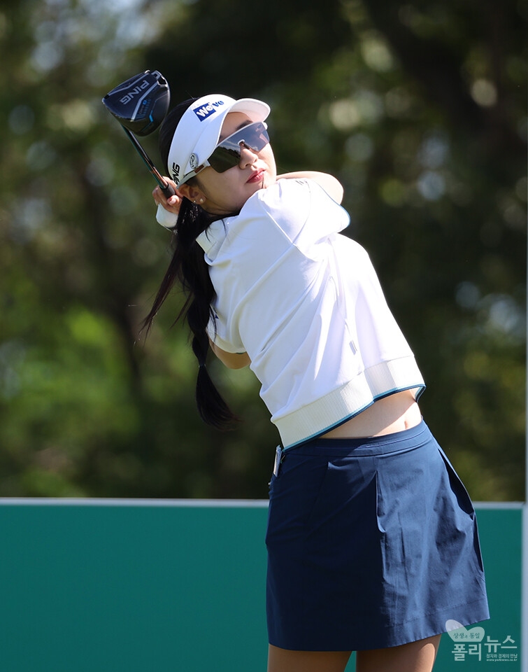성유진(25.대방건설)이 4번 홀에서 힘차게 티샷을 날리고 있다.