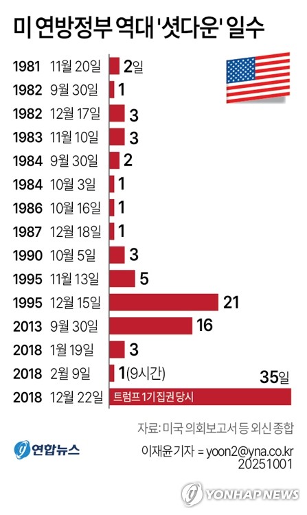 1980년 이후 미 연방정부는 14번의 셧다운을 겪었다. 그중 최장 기록은 트럼프 1기 행정부 때인 2018∼2019년 34일간 지속된 셧다운이다. 당시 트럼프 대통령이 멕시코와의 국경에 장벽을 건설하는 예산이 충분하지 않다며 법안에 거부권을 행사한 것이 원인이 됐다.