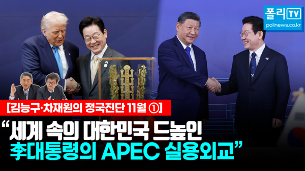 ![김능구 폴리뉴스 대표와 차재원 부산가톨릭대 특임교수는 5일 오후 폴리뉴스 본사에서 2025년 11월 정국진단을 진행했다. 김 대표와 차 교수는 APEC정상회의 기간 외교 슈퍼위크에 대해 평가하는 대담을 가졌다. [사진=폴리뉴스 이준수PD]](https://cdn.polinews.co.kr/news/photo/202511/712857_526444_3331.png)