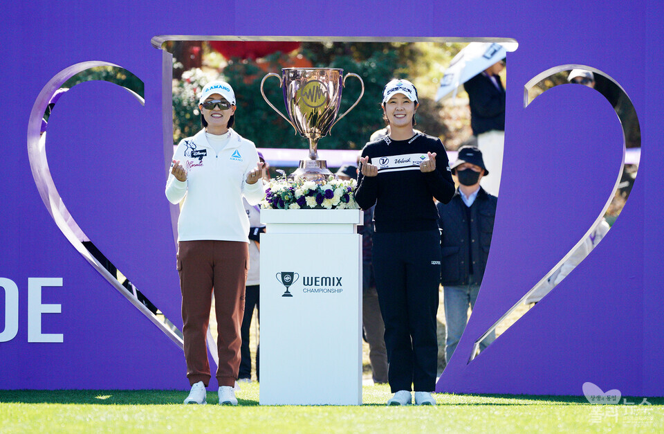 매치 플레이 맞대결을 펼치는 박지영과 이예원이 티샷 전 손하트로 팬들에게 인사를 하고 있다.