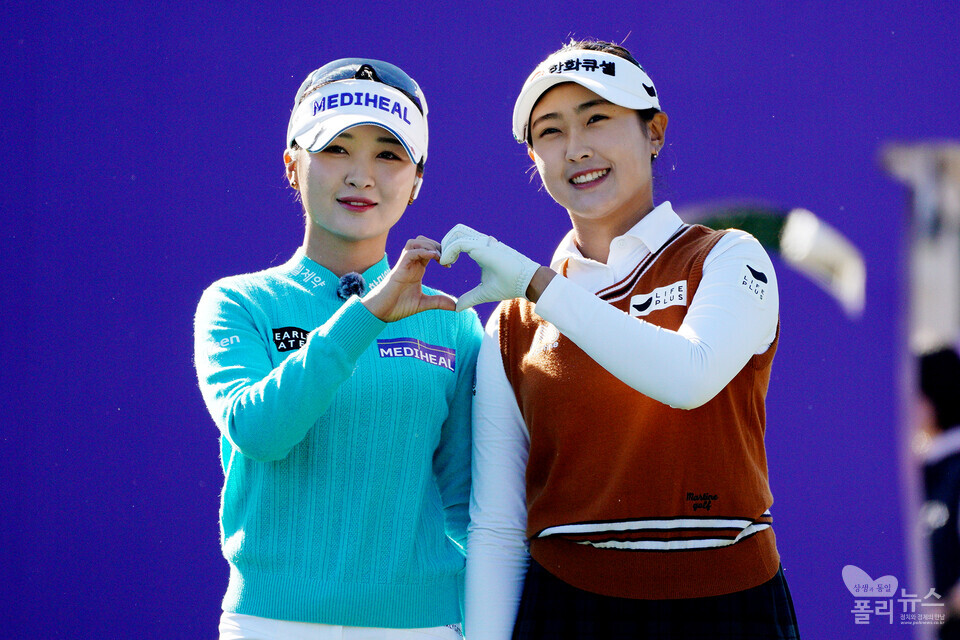 이예원과 김민주가 1번 홀 매치플레이 맞대결 전 손하트로 팬들에게 인사를 하고 있다.