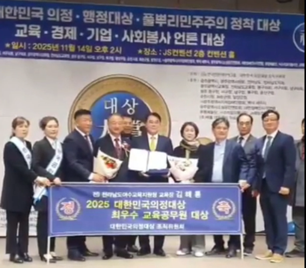 [폴리뉴스 이형권(=호남) 기자] 37년 동안 전남 교육현장을 이끌어온 김해룡 전 대통령소속 국가교육위원회 디지털·A1교육 특별위원 '2025 대한민국 의정대상'에서 최우수교육공무원대상을 부문을 수상했다.