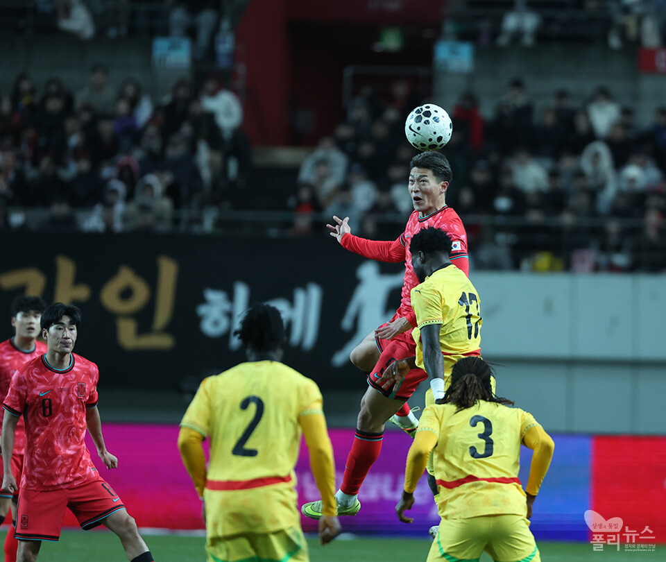 한국의 조규성(미트윌란))이 공중볼을 따내고 있다.