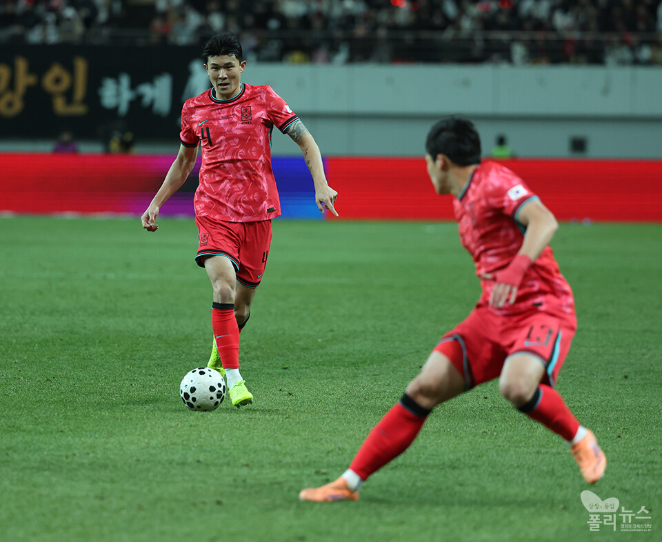 한국의 김민재(바이에른 뮌헨)가 패스를 하고 있다.