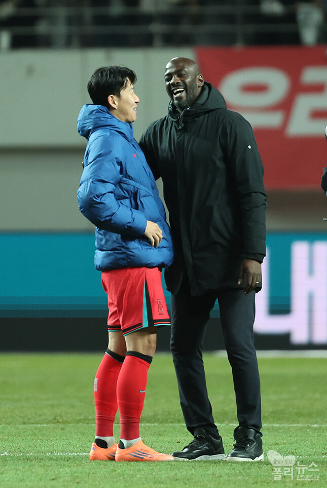 손흥민의 함부르크(독일) 유스 시절 스승인 가나의 오토 아도 감독을 경기 후 만나고 있다.