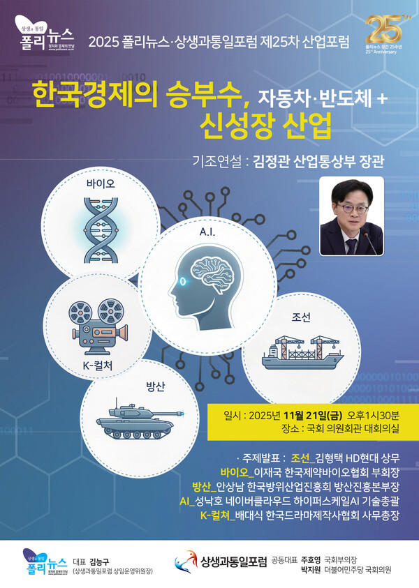 2025년 한국 산업의 핵심 전략을 논의하는 '폴리뉴스·상생통일포럼 제25차 포럼'이 21일 오후 1시 30분, 국회 의원회관 대회의실에서 열린다. 반도체·자동차 등 전통 주력 산업과 함께 AI, 조선, 방산, 제약·바이오, K-컬처를 아우르는 신성장 축의 방향성을 종합 점검하는 자리다.