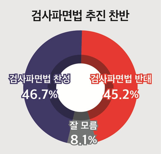 더불어민주당에서 논의 중인 검사파면법에 대해 찬성 46.7%, 반대 45.2%로 팽팽하게 갈렸다.