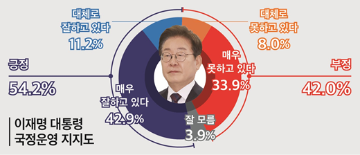 이재명 대통령 국정운영 지지도…긍정 54.2% vs 부정 42.0%